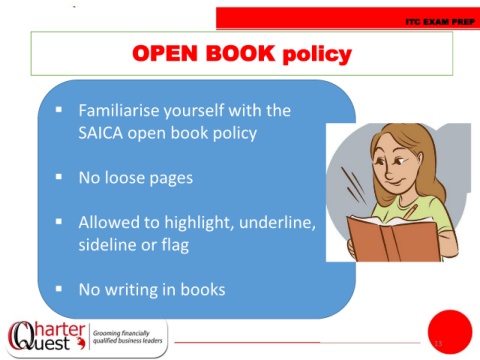 ITC EXAM PREP OPEN BOOK policy Familiarise yourself with the SAICA open book policy No loose pages Allowed to highlight, underline, sideline or flag No writing in books 13