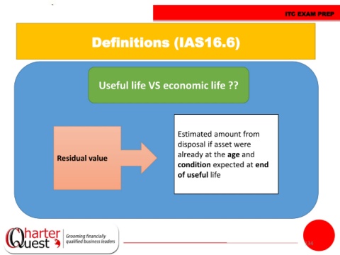 ITC EXAM PREP Definitions (IAS16.6) Useful life VS economic life ?? Estimated amount from disposal if asset were already at the age and Residual value condition expected at end of useful life 134
