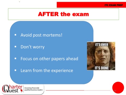 ITC EXAM PREP AFTER the exam Avoid post mortems! Don’t worry Focus on other papers ahead Learn from the experience 14