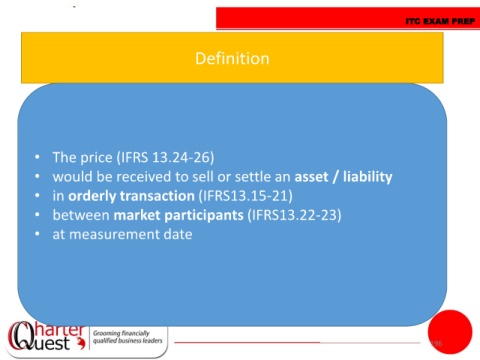 ITC EXAM PREP Definition • The price (IFRS 13.24-26) • would be received to sell or settle an asset / liability • in orderly transaction (IFRS13.15-21) • between market participants (IFRS13.22-23) • at measurement date 196