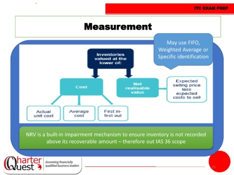ITC EXAM PREP Measurement May use FIFO, Weighted Average or Specific identification NRV is a built‐in impairment mechanism to ensure inventory is not recorded above its recoverable amount – therefore out IAS 36 scope 25