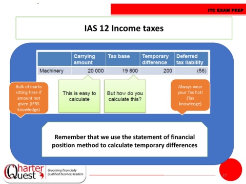 ITC EXAM PREP IAS 12 Income taxes Bulk of marks Always wear sitting here if your Tax hat! amount not (Tax given (IFRS knowledge) knowledge) Remember that we use the statement of financial position method to calculate temporary differences 47