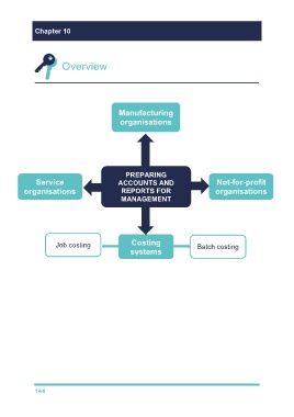 Chapter 10 Overview Manufacturing organisations PREPARING Service ACCOUNTS AND Not-for-profit organisations REPORTS FOR organisations MANAGEMENT Job costing Costing Batch costing systems 144