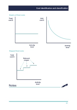 Cost identification and classification Graphs of fixed costs Total Unit cost $ cost $ Activity Activity level level ion Stepped fixed costs Total cost $ Relevant ranges 3 2 1 Activity level 25