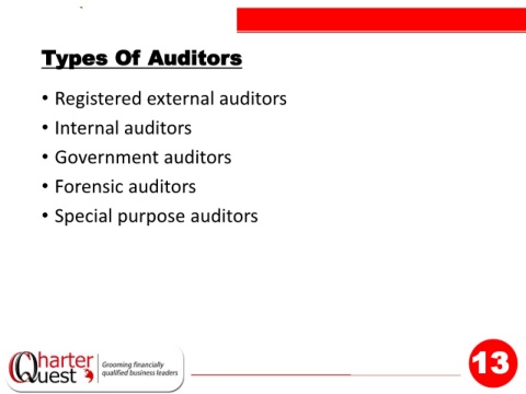 Types Of Auditors • Registered external auditors • Internal auditors • Government auditors • Forensic auditors • Special purpose auditors 13