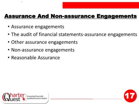 Assurance And Non-assurance Engagements • Assurance engagements • The audit of financial statements-assurance engagements • Other assurance engagements • Non-assurance engagements • Reasonable Assurance 17