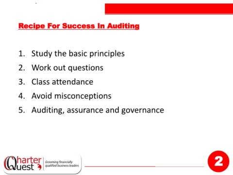 Recipe For Success In Auditing 1. Study the basic principles 2. Work out questions 3. Class attendance 4. Avoid misconceptions 5. Auditing, assurance and governance 2