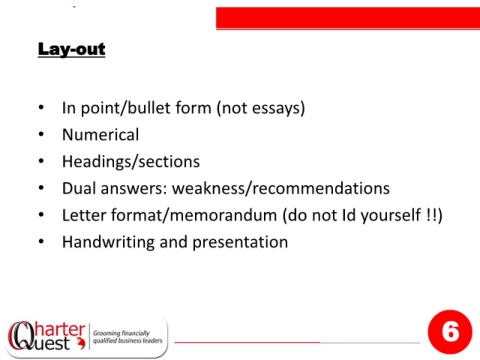 Lay-out • In point/bullet form (not essays) • Numerical • Headings/sections • Dual answers: weakness/recommendations • Letter format/memorandum (do not Id yourself !!) • Handwriting and presentation 6