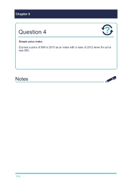 Chapter 9 Question 4 Simple price index Express a price of $99 in 2015 as an index with a base of 2012 when the price was $80. Price in any given year P 1 Price Index = × 100 = × 100 Price in base year P 0 2015 index = $99/$80 × 100 = 123.75 138