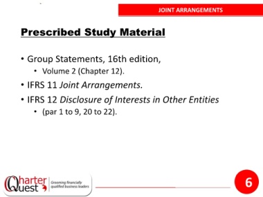 JOINT ARRANGEMENTS Prescribed Study Material • Group Statements, 16th edition, • Volume 2 (Chapter 12). • IFRS 11 Joint Arrangements. • IFRS 12 Disclosure of Interests in Other Entities • (par 1 to 9, 20 to 22). 6