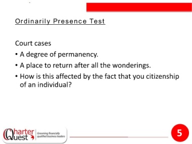 Ordinarily Presence Test Court cases • A degree of permanency. • A place to return after all the wonderings. • How is this affected by the fact that you citizenship of an individual? 5