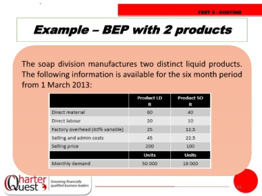 TEST 3 - COSTING Example – BEP with 2 products The soap division manufactures two distinct liquid products. The following information is available for the six month period from 1 March 2013: 93