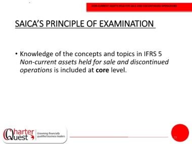NON-CURRENT ASSETS HELD FOR SALE AND DISCONTINUED OPERATIONS SAICA’S PRINCIPLE OF EXAMINATION • Knowledge of the concepts and topics in IFRS 5 Non-current assets held for sale and discontinued operations is included at core level. 29