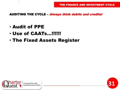 THE FINANCE AND INVESTMENT CYCLE AUDITING THE CYCLE – Always think debits and credits! • Audit of PPE • Use of CAATs…!!!!!! • The Fixed Assets Register 131