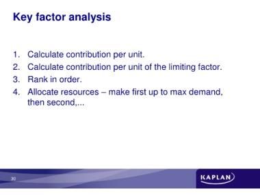 Key factor analysis 1. Calculate contribution per unit. 2. Calculate contribution per unit of the limiting factor. 3. Rank in order. 4. Allocate resources – make first up to max demand, then second,... 30