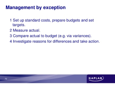 Management by exception 1 Set up standard costs, prepare budgets and set targets. 2 Measure actual. 3 Compare actual to budget (e.g. via variances). 4 Investigate reasons for differences and take action. 70