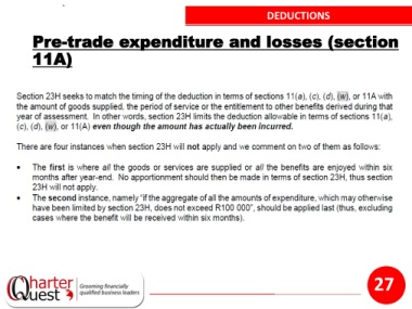 DEDUCTIONS Pre-trade expenditure and losses (section 11A) 27
