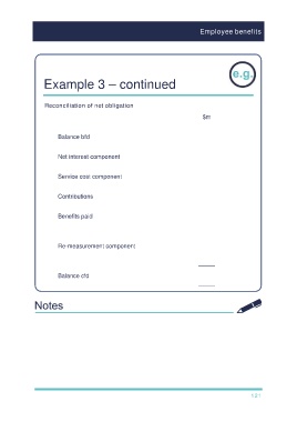 Employee benefits Example 3 – continued Reconciliation of net obligation $m Balance bfd Net interest component Service cost component Contributions Benefits paid Re-measurement component ––––– Balance cfd ––––– 121