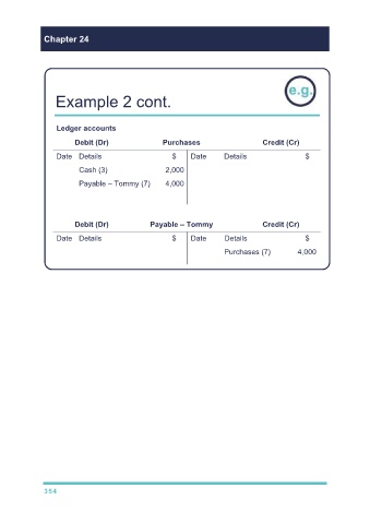 Chapter 24 Example 2 cont. Ledger accounts Debit (Dr) Purchases Credit (Cr) Date Details $ Date Details $ Cash (3) 2,000 Payable – Tommy (7) 4,000 Debit (Dr) Payable – Tommy Credit (Cr) Date Details $ Date Details $ Purchases (7) 4,000 354