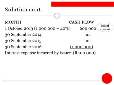 Solution cont. MONTH CASH FLOW Initial 1 October 2013 (1 000 000 – 40%) 600 000 amount 30 September 2014 nil 30 September 2015 nil 30 September 2016 (1 000 000) Interest expense incurred by issuer (R400 000)