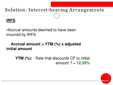 Solution: Interest-bearing Arrangements IRFS •Accrual amounts deemed to have been incurred by IRFS Accrual amount = YTM (%) x adjusted initial amount YTM (%): Rate that discounts CF to initial amount ? = 12.35%