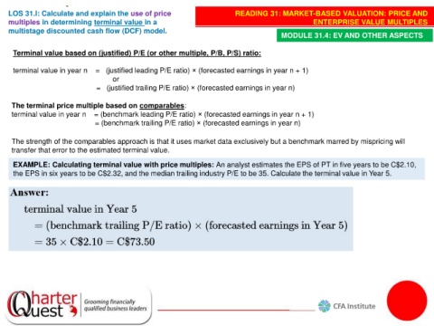 EXAMPLE: Calculating terminal value with price multiples: An analyst estimates the EPS of PT in five years to be C$2.10,