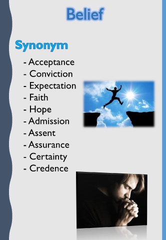 - Acceptance - Conviction - Expectation - Faith - Hope - Admission - Assent - Assurance - Certainty - Credence