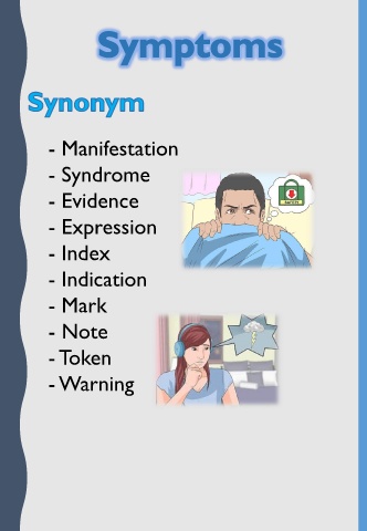 - Manifestation - Syndrome - Evidence - Expression - Index - Indication - Mark - Note - Token - Warning