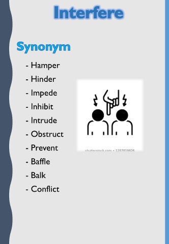 - Hamper - Hinder - Impede - Inhibit - Intrude - Obstruct - Prevent - Baffle - Balk - Conflict