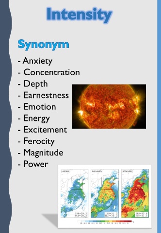 - Anxiety - Concentration - Depth - Earnestness - Emotion - Energy - Excitement - Ferocity - Magnitude - Power