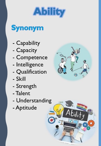- Capability - Capacity - Competence - Intelligence - Qualification - Skill - Strength - Talent - Understanding - Aptitude
