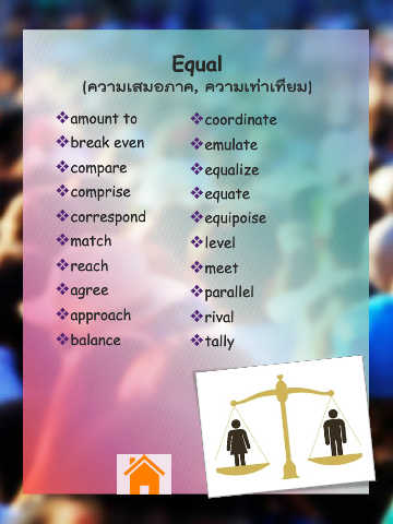 Equal (ความเสมอภาค, ความเท่าเทียม) ❖amount to ❖coordinate ❖break even ❖emulate ❖compare ❖equalize ❖comprise ❖equate ❖correspond ❖equipoise ❖match ❖level ❖reach ❖meet ❖agree ❖parallel ❖approach ❖rival ❖balance ❖tally