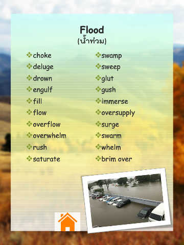 Flood (น าท่วม) ❖choke ❖swamp ❖deluge ❖sweep ❖drown ❖glut ❖engulf ❖gush ❖fill ❖immerse ❖flow ❖oversupply ❖overflow ❖surge ❖overwhelm ❖swarm ❖rush ❖whelm ❖saturate ❖brim over