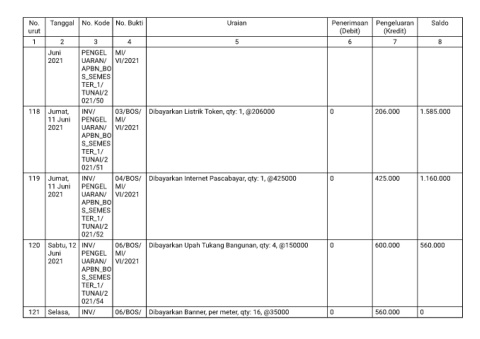 No. Tanggal No. Kode No. Bukti Uraian Penerimaan Pengeluaran Saldo