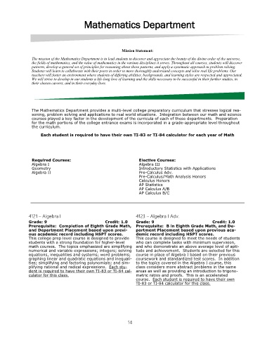 The Mathematics Department provides a multi-level college preparatory curriculum that stresses logical rea-
