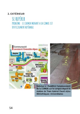 2. EXTÉRIEUR SE REPÉRER PROBLÈME : LE CHEMIN MENANT A LA COMUE EST DIFFICILEMENT REPÉRABLE Solution 1 : Redéfinir l'emplacement de la COMUE sur le campus depuis la station de Tram Gabriel Fauré et/ou Bibliothèques Universitaires 54