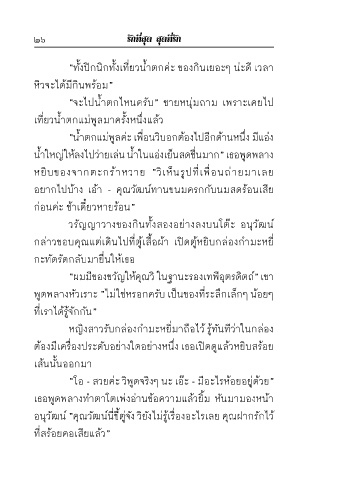 เธอพูดพลางท�าตาโตเพ่งอ่านข้อความแล้วยิ้ม หันมามองหน้า “สวยมากครับ ความจริงคุณวิสวยอยู่แล้ว จะสวมจะ