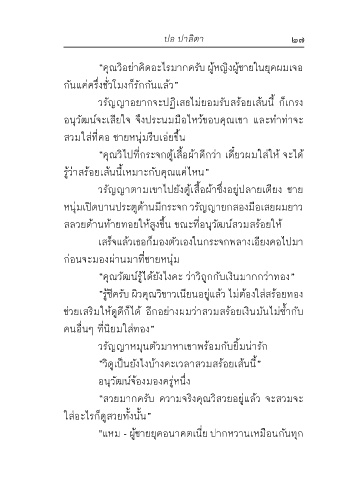 พูดพลางหัวเราะ “ไม่ใช่หรอกครับ เป็นของที่ระลึกเล็กๆ น้อยๆ “รู้ซีครับ ผิวคุณวิขาวเนียนอยู่แล้ว ไม่ต้องใส่สร้อยทอง