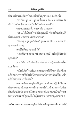 ท่าทางร้อนรน ลืมตาโพลงเมื่อเห็นลูกชายนั่งบนเตียงนั้น อธิบายว่าขณะนี้อาการคนไข้กลับสู่สภาวะเกือบปกติ ต้องบ�ารุง