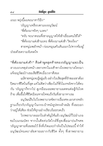 “พี่ต้องมาแต่เช้า” คือค�าพูดสุดท้ายของวรัญญาและเป็น พระสงฆ์ ๔ รูปสวดพระอภิธรรมเสร็จ ชายหนุ่มถวาย