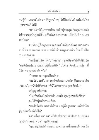 ป่วยแต่ละคน สักครู่ใหญ่ๆ จึงมาถึงเตียงของเขา พยาบาลสาว "พอดีบัตรประชาชนผมอยู่ที่ออฟฟิศ ไม่ได้เอาติดตัวมา เอ้อ - ที่