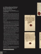Speci cations: [5] letters of ordination pasted onto a thick cardboard leaf with the original binding, bound together with an excerpt from the speech at the reception held for him by the children of the community, which begins with the words,“May G-d be with you our master, teacher and rabbi!״ e entire text is written in vowelized block handwriting, and ends with the children׳s cry,“May our master and teacher Rabbi Chanoch live forever.״ Summary of each document translated into Hungarian on facing pages.