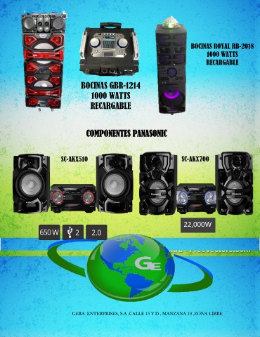 BOCINAS ROYAL RB-2018 1000 WATTS RECARGABLE BOCINAS GBR-1214 1000 WATTS RECARGABLE B B COMPONENTES PANASONIC SC-AKX510 SC-AKX700 22,000W GERA ENTERPRISES, S.A ,CALLE 15 Y D , MANZANA 10 ,ZONA LIBRE