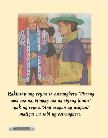 Nakiusap ang reyna sa estranghero. “Parang awa mo na. Huwag mo na siyang kunin,” iyak ng reyna. “Ang usapan ay usapan,” matigas na sabi ng estranghero.