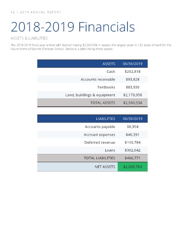 The 2018-2019 fiscal year ended with Banner having $2,560,534 in assets; the largest asset is 125 acres of land for the