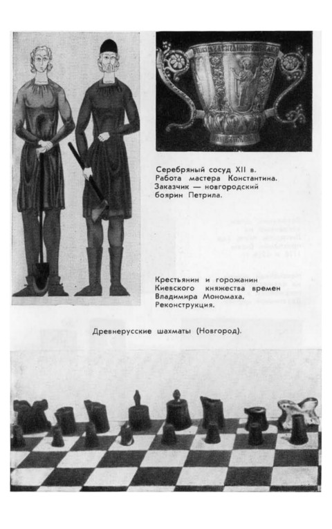 Серебряный сосуд Х" в. Работа мастера Константина . Заказчик -- н овгородски й боярин Петр ила . Крестьянин и горожан ин Киевского княжества времен Владимира Мономаха. Рек онструкци я . Древнерусские шахматы (Новгород) .