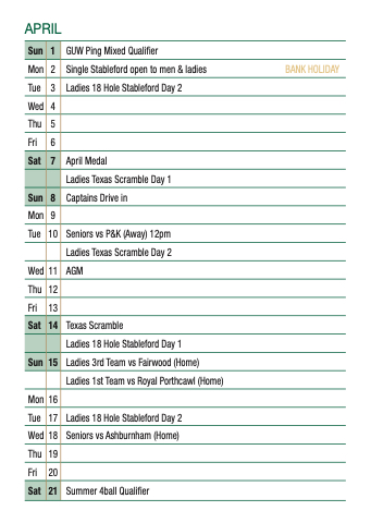 Tue Ladies 18 Hole Stableford Day 2 Wed Seniors vs Ashburnham (Home) Thu