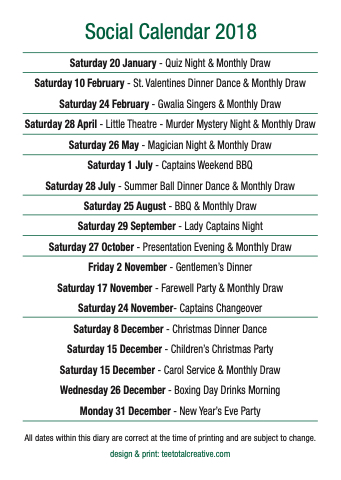 Saturday 10 February - St. Valentines Dinner Dance & Monthly Draw Saturday 24 February - Gwalia Singers & Monthly Draw Saturday 28 April - Little Theatre - Murder Mystery Night & Monthly Draw Saturday 26 May - Magician Night & Monthly Draw