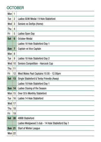 Mon Over 55’s Monthly Stableford Tue Ladies 14 Hole Stableford Wed