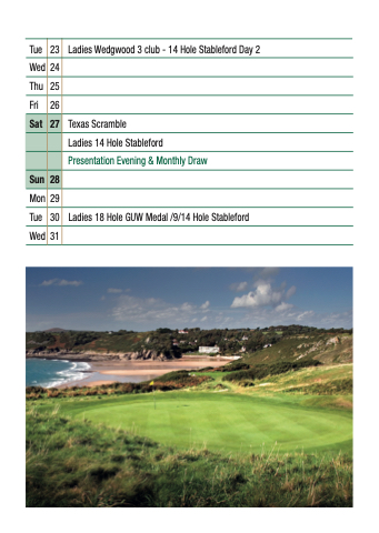 Tue Ladies Wedgwood 3 club - 14 Hole Stableford Day 2 Wed Thu Fri Texas Scramble Ladies 14 Hole Stableford Presentation Evening & Monthly Draw Mon Tue Ladies 18 Hole GUW Medal /9/14 Hole Stableford Wed Sat Sun 23 24 25 26 27 28 29 30 31